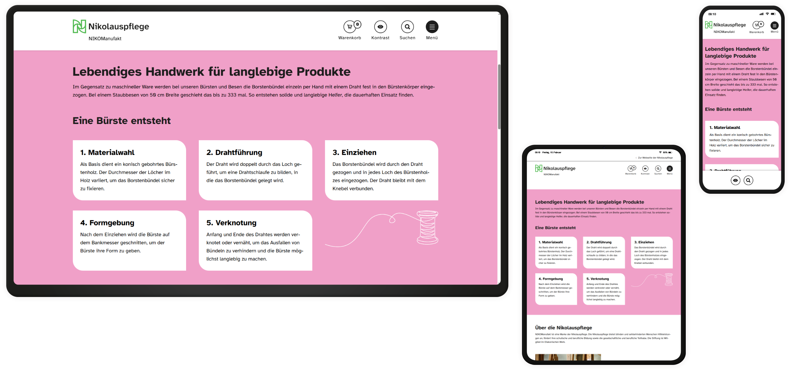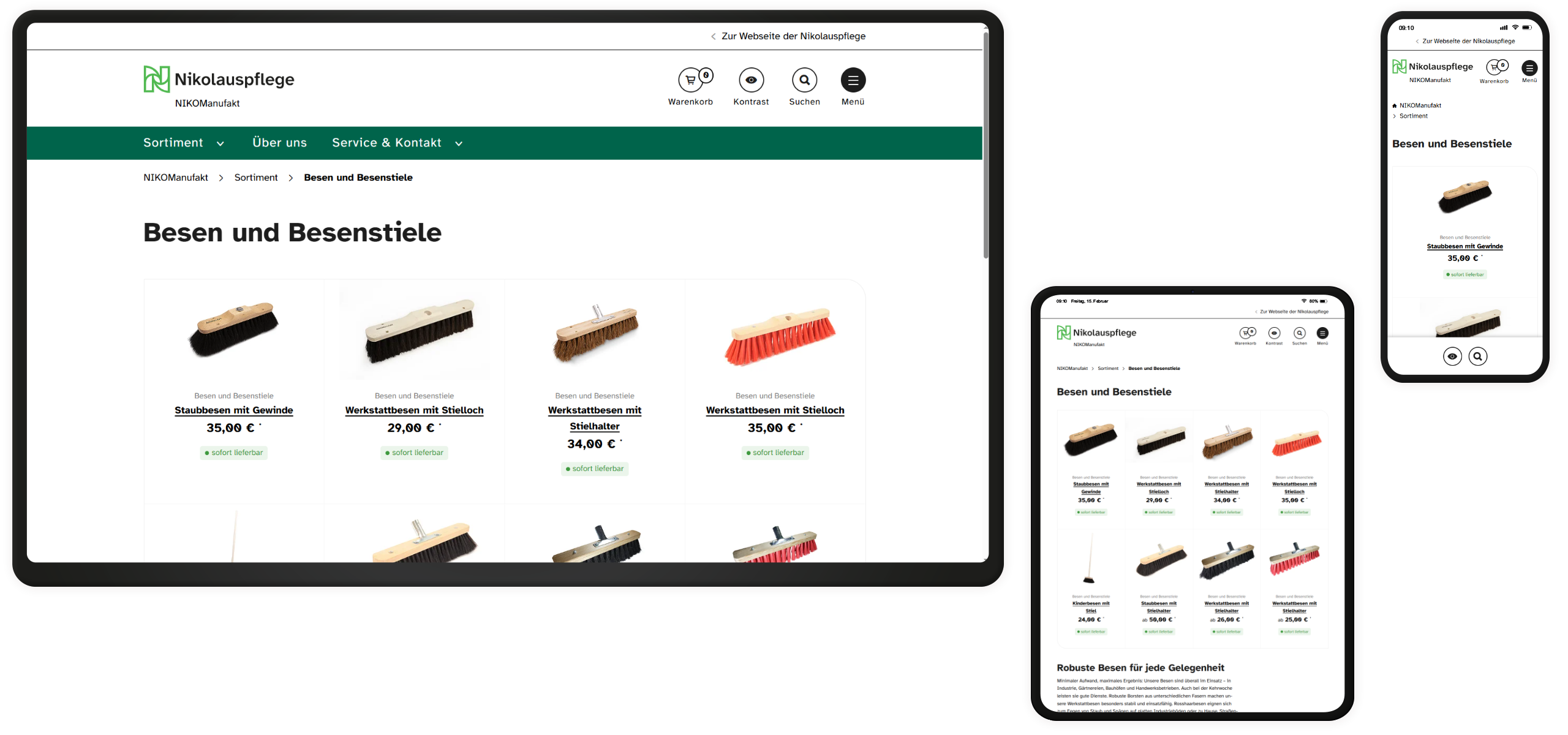Unter dem Label NIKOManufakt der Nikolauspflege Stuttgart fertigen blinde und sehbehinderte Bürstenmacherinnen und Bürstenmacher qualitativ hochwertige Besen und Bürsten. Bestellungen konnte die treue Kundschaft aus ganz Deutschland bisher allerdings nur umständlich per Anfrage oder online für ein eingeschränktes Sortiment über Drittanbieter-Marktplätze aufgeben. Daher beauftragte uns die Nikolauspflege mit der Konzeption und Umsetzung eines Online-Shops, der barrierefrei ausgestaltet werden sollte.